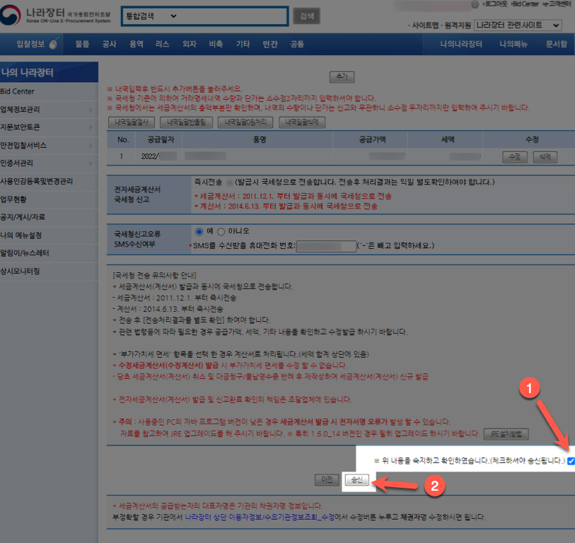 - 납품완료 후 100% 계산서를 발행하는 것이라면 대부분 기본적인 내용이 들어가 있어 별도로 기입해야할 내용이 없다. 관련 내용들을 확인 후 아래사진과 같이 체크버튼을 체크하고 송신을 클릭하여 세금계산서 발행을 완료한다.